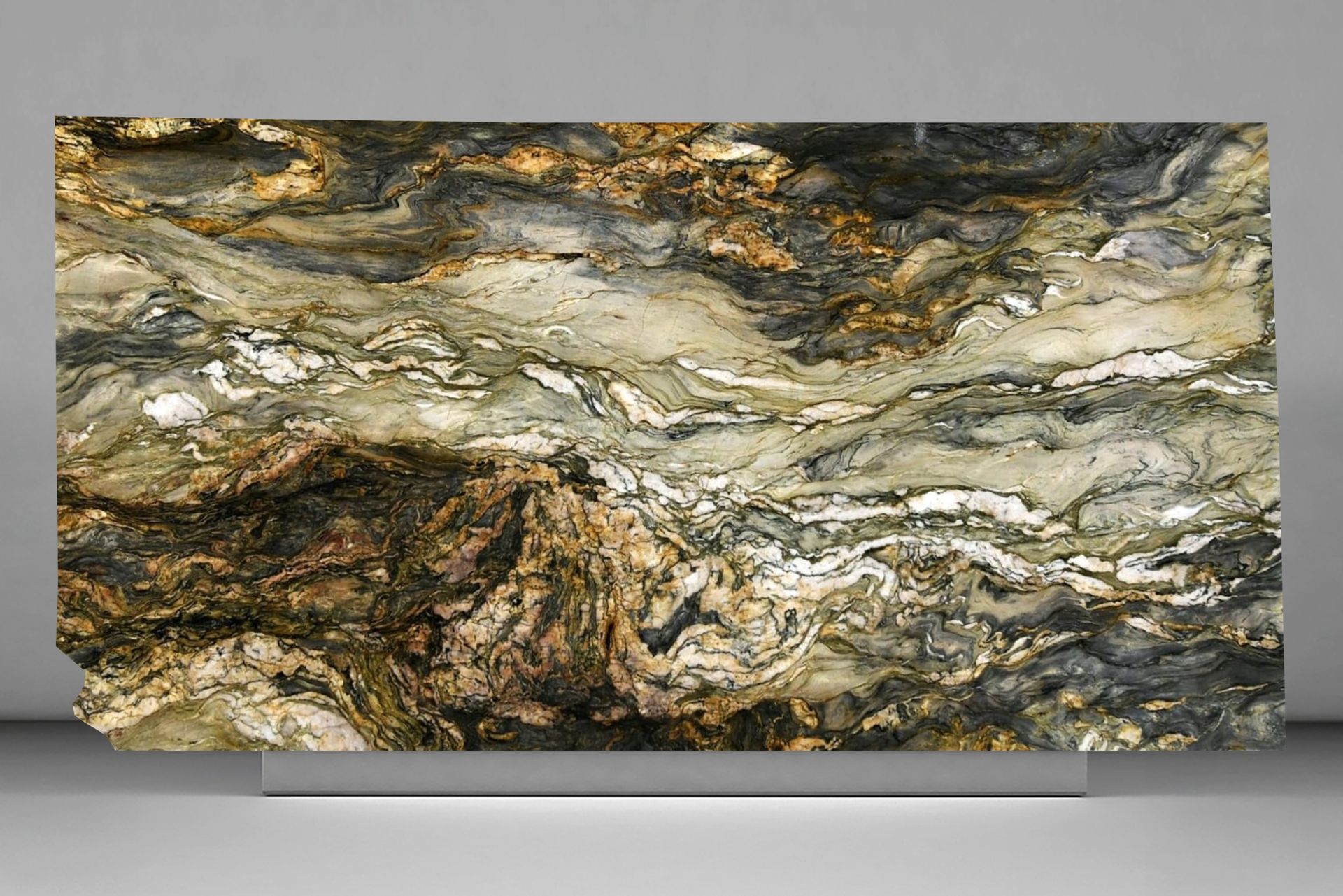 La cuarcita Fusion combina una intensa variedad de colores —negros, dorados, verdes y blancos— en un patrón fluido y vibrante que recuerda a formaciones geológicas en movimiento. Su alto impacto visual la convierte en una pieza ideal para espacios protagonistas, como mesadas, islas, paredes o recepciones. Además de su atractivo estético, ofrece gran resistencia y durabilidad.